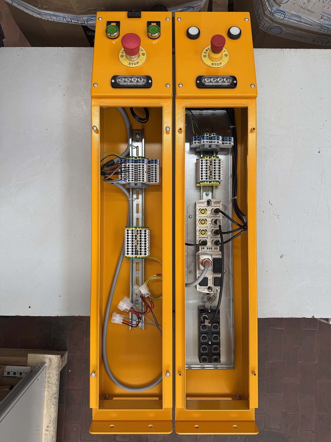 Zhustené skladovacie systémy od spoločnosti Ferall sa vyznačujú vysokou bezpečnostnou úrovňou a spĺňajú všetky platné predpisy. Disponujú rôznymi ovládacími a rozpoznávacími systémami, ktoré zaručujú bezpečnú prevádzku – napríklad snímače na rozpoznanie osôb na chodbách a okrajových oblastiach (ochrana proti stlačeniu), ako aj systémy na ochranu proti prevráteniu pre podvozky. Veľké množstvo týchto snímačov sa musí spoľahlivo riadiť a napájať energiou. Z toho vyplývajú vysoké náklady na kabeláž s početnými vedeniami a prierezmi dimenzovanými na veľký rozmer. K tomu sa pridá potreba miesta pre rozsiahlu techniku skriňových rozvádzačov, v ktorej sú umiestnené svorkovnice, odbočkové zásuvky, elektrické zariadenia a riadenia PLC. Na zredukovanie tejto zložitosti a efektívnejšie stvárnenie signálových, ako aj prúdových spojení medzi skriňovým rozvádzačom a regálmi hľadala spoločnosť Ferall vhodné riešenie.
